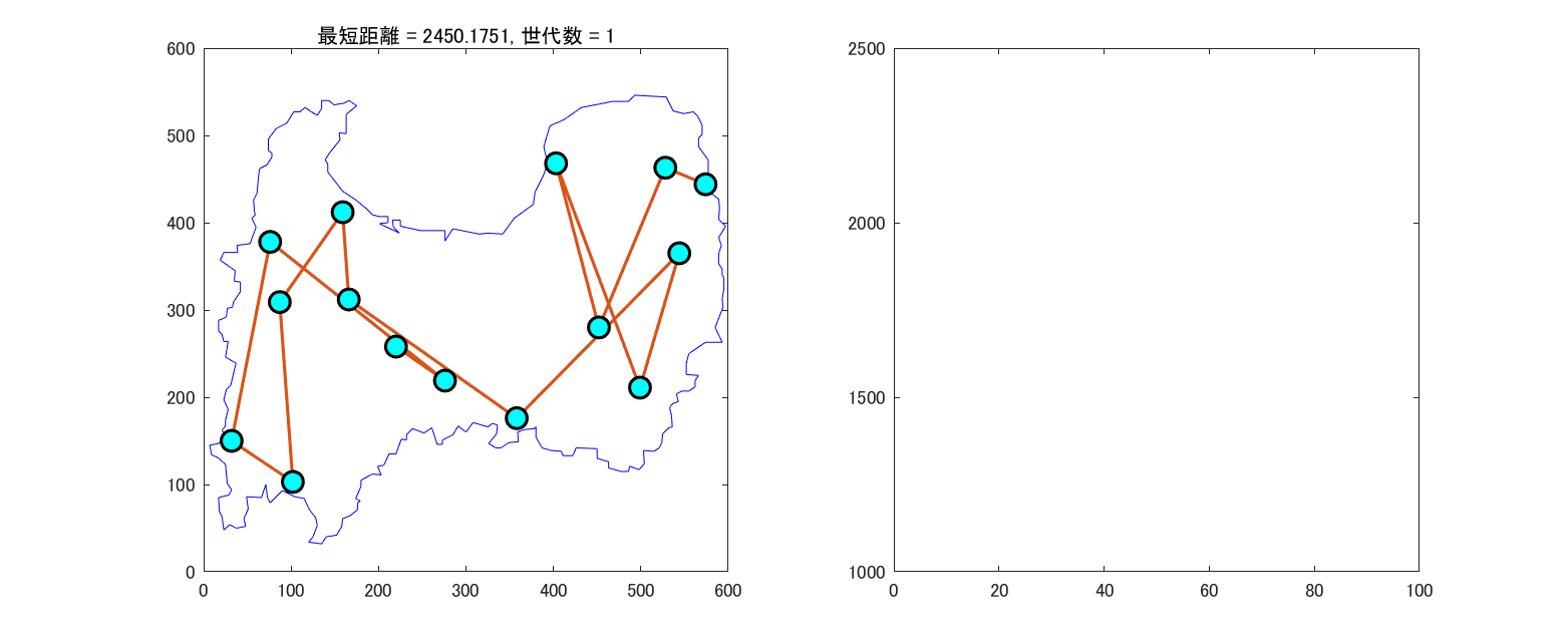 左図は道順を表しており、右のグラフは縦軸に移動距離、横軸に世代数を表しています。